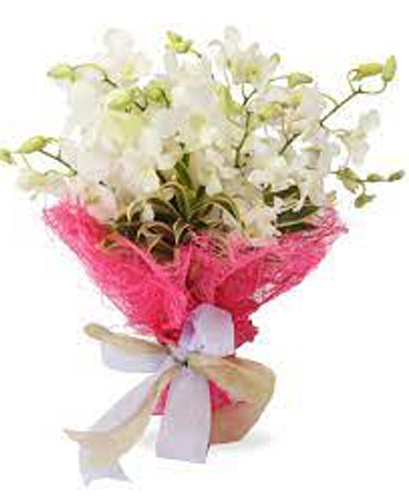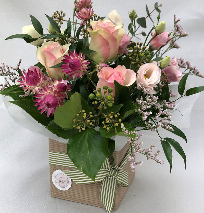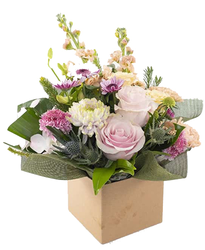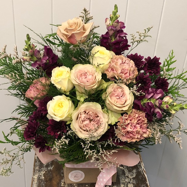New Baby Vibrant Hand tied or Vase. Asiatic Lilies, Carnations and Freesias in delicate shades of white and pink.